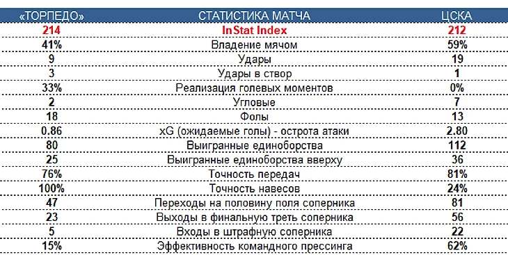 🕮 Факты: ◉ У «Торпедо» прервалась серия из шести поражений в РПЛ. ◉ «Торпедо» не побеждало в РПЛ 2667 дней – с сезона-2014/15. ◉ «Торпедо» впервые за последние 14 матчей РПЛ сумело уберечь свои ворота от пропуска мячей в играх с ЦСКА. ◉ «Торпедо» обыграло ЦСКА в чемпионате России впервые с 2003 года. ◉ С другой стороны, ЦСКА в последних девяти матчах на выезде одержал лишь одну победу. Ведь формально этот матч был для армейцев выездным.