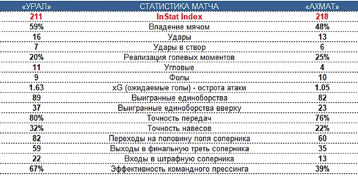Счёт матча в соответствии с xG (ожидаемыми голами) – 2:1 в пользу «Урала». Лучший игрок матча по версии эксперта канала Матч-Премьер – Гиорги Шелия. Лучшие игроки матча по версии InStat Index – Бернар Бериша (266), Евгений Харин (263), Антон Швец (257).