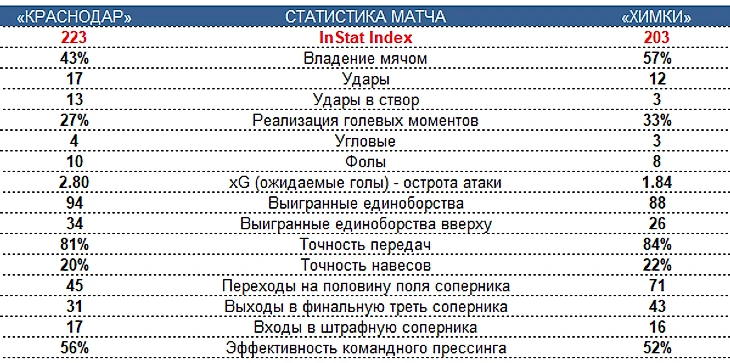 Счёт матча в соответствии с xG (ожидаемыми голами) – 4:2 в пользу «Краснодара». Лучший игрок матча по версии эксперта канала Матч-Премьер – Никита Кривцов. Лучшие игроки матча по версии InStat Index – Никита Кривцов (263), Кевин Ленини и Жоау Батчи (по 254).