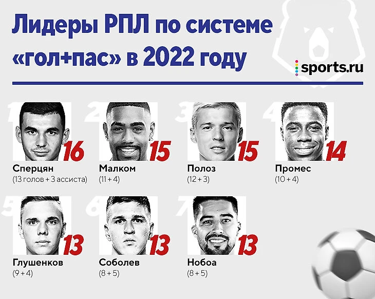 • Еще Сперцян вырвался в лидеры по системе «гол+пас» в этом году – вот лучшие по этому показателю в Мир РПЛ-2022 (цифры из телеграм-канала Александра Дорского).