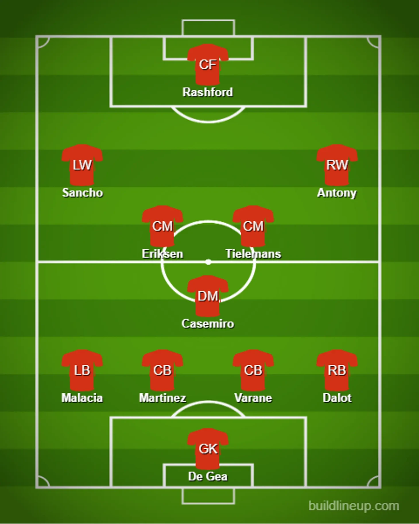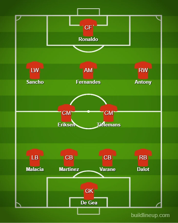 Тилеманс может неплохо сыграть роль атакующего полузащитника, а это значит, что если необходимо, стать заменой Бруну Фернандешу. Вероятно, что он также может поменяться местами с Кристианом Эриксеном и помочь сохранить интенсивность в центре. Вот, как выглядел бы состав, если заменить Фернандеша на Тилеманса.
