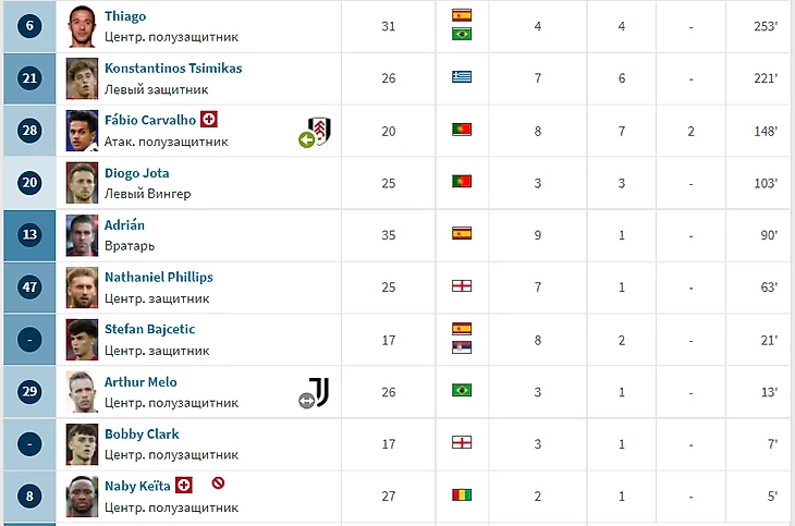В начале сезона «Ливерпуль» столкнулся с настоящей эпидемией травм и очевидно, что это повлияло на игру команды. В результате Харви Эллиотт попал в десятку по наигрышу, а Диогу Жота провел на поле всего 103 минуты.