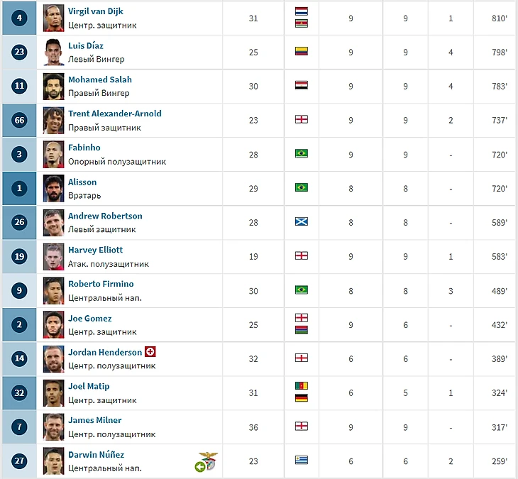 Ван Дейк − первый, Кейта − последний. Сколько наиграли в этом сезоне игроки «Ливерпуля»?