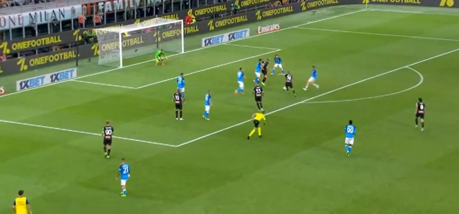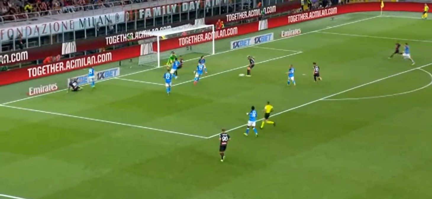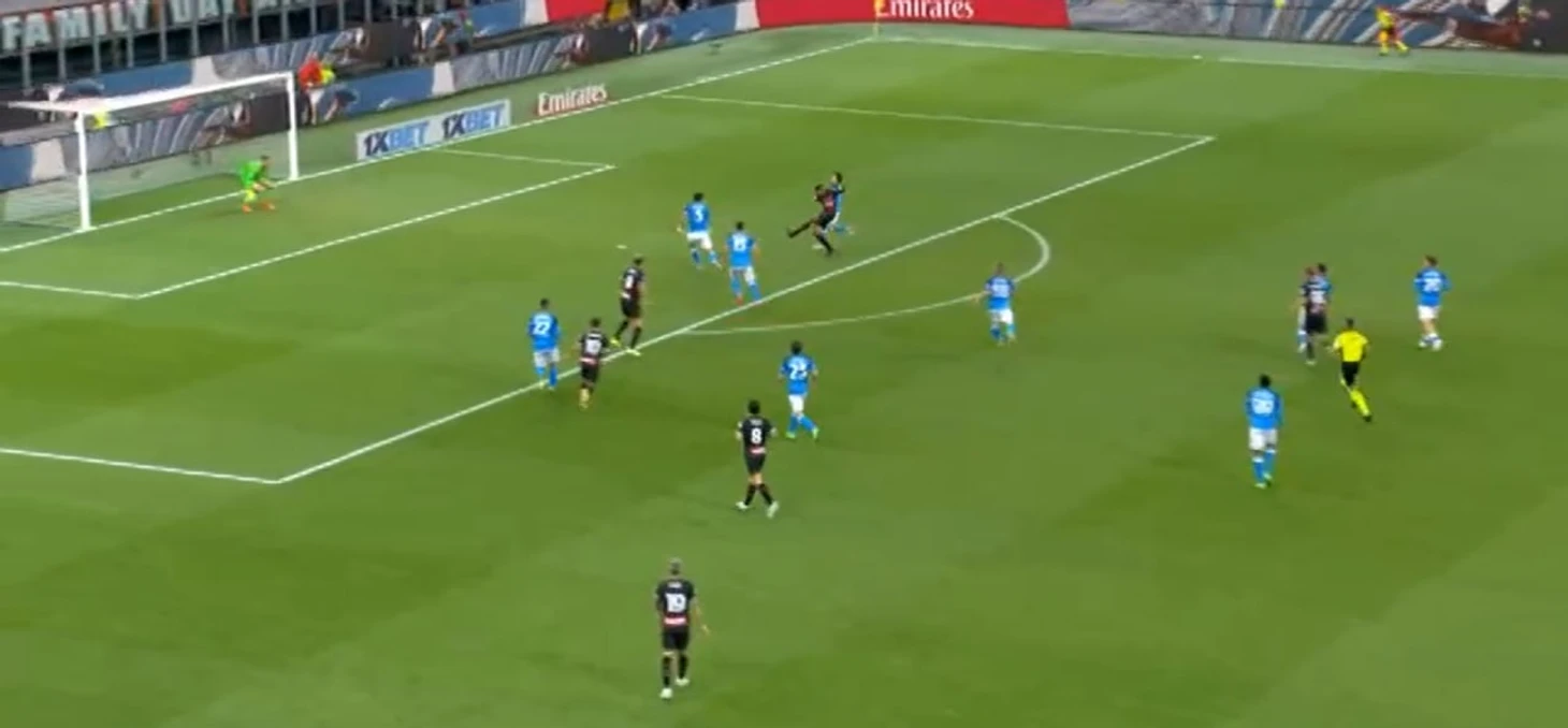 Желание Пиоли заменить Леау сказалось на перемещениях не только Тео, но и остальных игроков: непонятна была роль Калабрии. Он несомненно здорово играл против Кварацхелии ближе к центру поля, правда, получил ненужную желтую карточку. Проблема в том, что когда у Хвичи получалось пройти дальше, его встречал Кьяер, а вот это уже было грустно. Когда датчанину помогал Беннасер, у них вдвоем получалось закрыть правый фланг, но потом алжирец это дело бросил, решив попробовать что-то новое. Злость и обиду Кьяера на Беннасера можно увидеть в этом ударе по ногам: