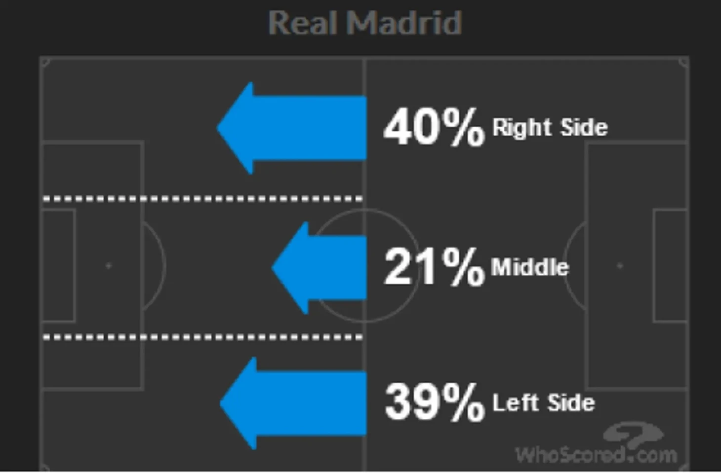 Лишь 21% атак «Реала» проходил через центр, ведь полузащитники были сосредоточены на создании возможностей для нападающих.