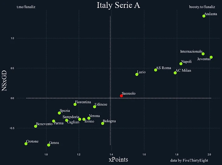 Неплохой атакующий перфоманс они из года в год перечёркивали проблемами в организации обороны — например, в тот сезон (20-21) Фиорентина, Специя и даже Торино допустили меньший нон-шот, чем Сассуоло, в итоге результат получался примерно на уровне качества их игры.