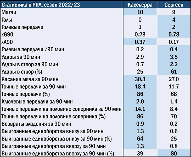 Колумбиец не любит вступать в единоборства, пытается сыграть на свободном пространстве. Потолкаться с защитником, выгрызть мяч за счет корпуса – это не про Кассьерру. Поэтому ему тяжело играть против организованных команд-автобусов с плотной обороной. Примечательно, что Сергеев борется ещё меньше, но в чужой штрафной чувствует себя уверенней.