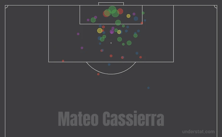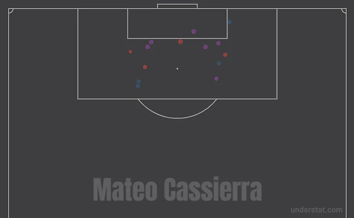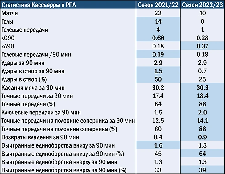 Статистика Кассьерры по сравнению с игрой в Сочи по многим компонентам либо стала лучше, либо не опустилась ниже прошлогоднего уровня. Колумбиец столько же бьет по воротам, совершает касаний мяча, лучше играет в пас и обороняется. Но вот с ударами в створ и реализацией есть ощутимые проблемы.