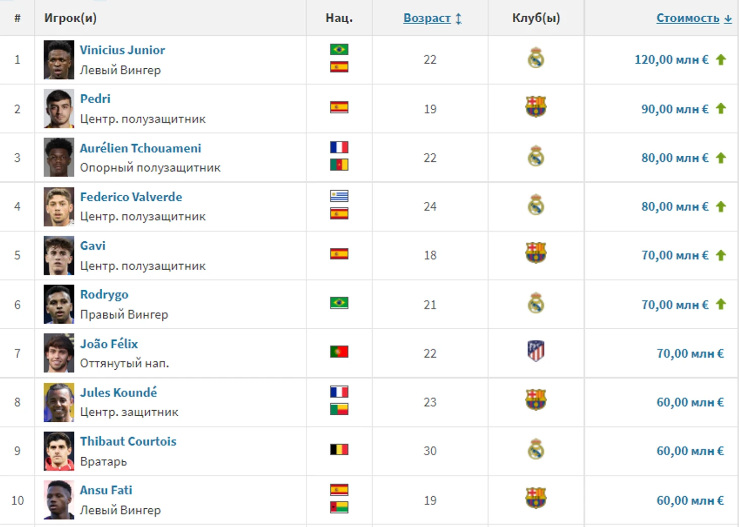 Ресурс Transfermarkt в очередной раз обновил трансферную стоимость всех игроков Ла Лиги. В почетную десятку самых дорогих футболистов испанского чемпионата вошло сразу четыре игрока: