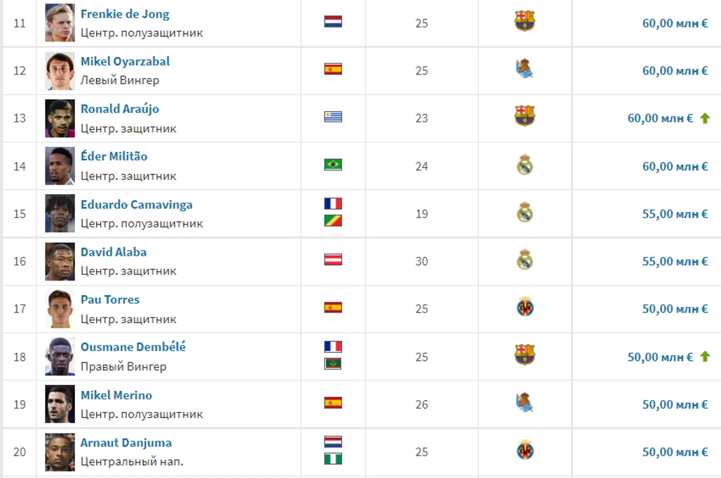 Также в двадцатке можно найти Френки Де Йонга (11 место, 25 лет, 60 млн евро), Рональда Араухо (13 место, 23 года, 60 млн) и Усмана Дембеле (18 место, 25 лет, 50 млн евро).