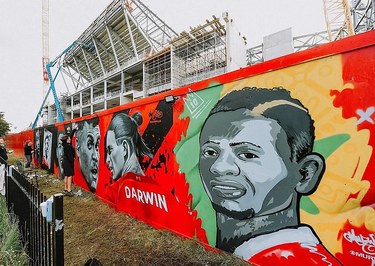 Роберто Фирмино, Садьо Мане, Мохамед Салах, Дивок Ориги, Диогу Жота, Луис Диас и Дарвин Нуньес попали на вторую часть мурала, который символизирует новую атакующую силу клуба.