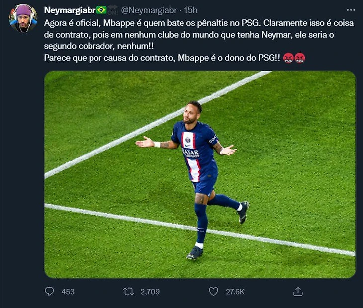 «Теперь официально: Мбаппе – штатный пенальтист «ПСЖ». Очевидно, что это прописано в контракте, потому что ни в одном другом клубе мира Неймар бы не был вторым пенальтистом в команде. Судя по всему, все из-за контракта. Мбаппе – владелец «ПСЖ», – такой твит в фан-аккаунте понравился Неймару.