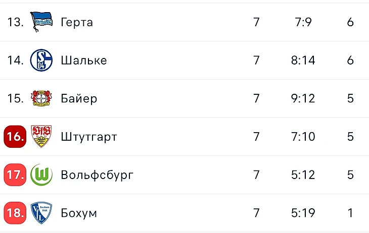 Безнадёжный Бохум, который пока играет роль прошлогоднее Гройтер Фюрт. Герта, Вольфсбург и Штутгарт, болельщикам которых и в этом году придётся вспоминать о том, как хорошо было раньше. Разбавляют эту компанию плохих учеников Шальке, которые как будто бы неплохо прошли очищение второй Бундеслигой. Ну и Байер, который задумался о Лиге Чемпионов, но позабыл о родном чемпионате. Хотя есть такая традиция в немецком клубном футболе, когда хоть одна команда играющая в еврокубках, напрочь проваливает сезон на внутренней арене. Ну и Патрик Шик после травмы перестал забивать.