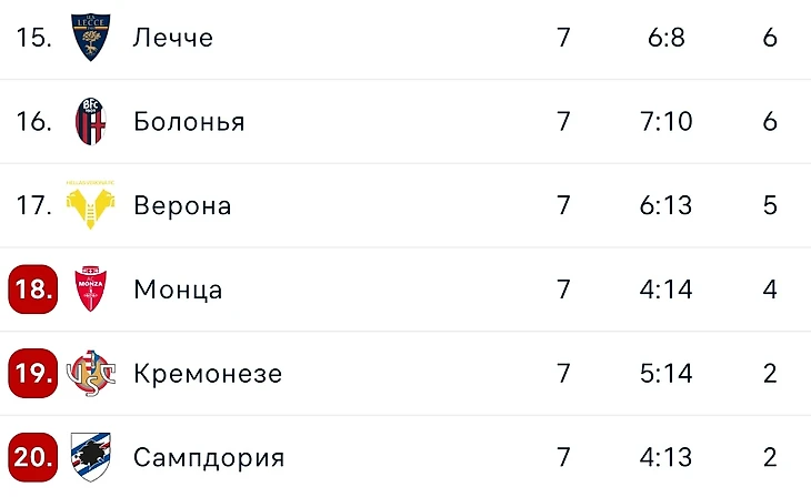 В Италии всё стабильно. Три новичка лиги не готовы к высшему дивизиону. Болонья и Сампдория до сих пор в атаке надеется на очень старых футболистов. По Вероне же видимо сильно ударил уход Симеоне. Забивать некому.