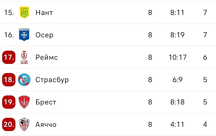 Из-за того, что ПСЖ вечно побеждает во внутреннем чемпионате, может показаться, что весь чемпионат довольно предсказуем. Если глянуть вниз турнирной таблице то хватает интересных моментов. Нант и Страсбур прошлый сезон закончили в десятке, Брест и Реймс особо за выживание тоже не боролись. И самое что интересное в целом все эти клубы сохранили состав, закупились молодёжью и... Ничего не работает вообще. Брест так вообще умудряется пропускать по семь мячей не от самых сильных конкурентов. На лицо тотальный кризис. Так вот. Если говорить о двух новичках которые находятся внизу, то у них ситуации разные. Осер начал сезон эмоционально и этих самых эмоций перестало хватать, пауза как раз может помочь. А вот Аяччо претендент на вылет , за счёт чего оставаться пока непонятно.