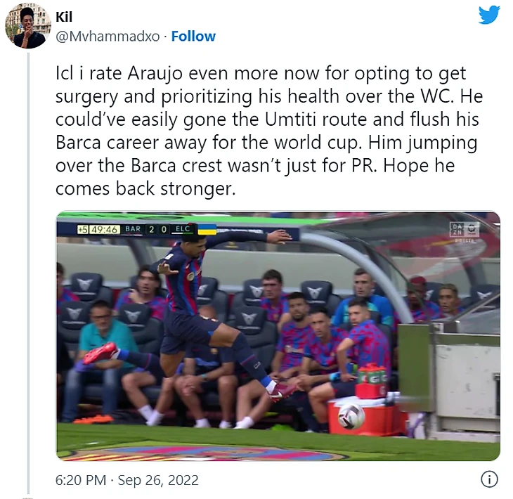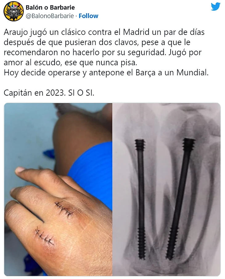 «Араухо сыграл в класико через пару дней после того, как ему ввинтили два шурупа, хотя из соображений безопасности ему не рекомендовали этого делать. Он играет из любви к гербу, на который никогда не наступает. Сегодня он решил сделать операцию и поставил «Барсу» выше чемпионата мира. Капитан в 2023 году? Да и да».