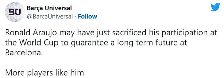 «Возможно, что Рональд Араухо только что пожертвовал своим участием на ЧМ, чтобы гарантировать себе долгосрочное будущее в «Барселоне». Побольше бы таких игроков».