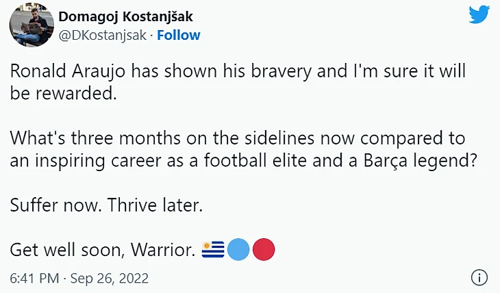 «Араухо проявил храбрость, и я уверен, что она будет вознаграждена. Что такое три месяца без футбола по сравнению с вдохновляющей карьеры и легенды «Барсы»? Страдай сейчас, процветай позже. Выздоравливай скорее, воин!»