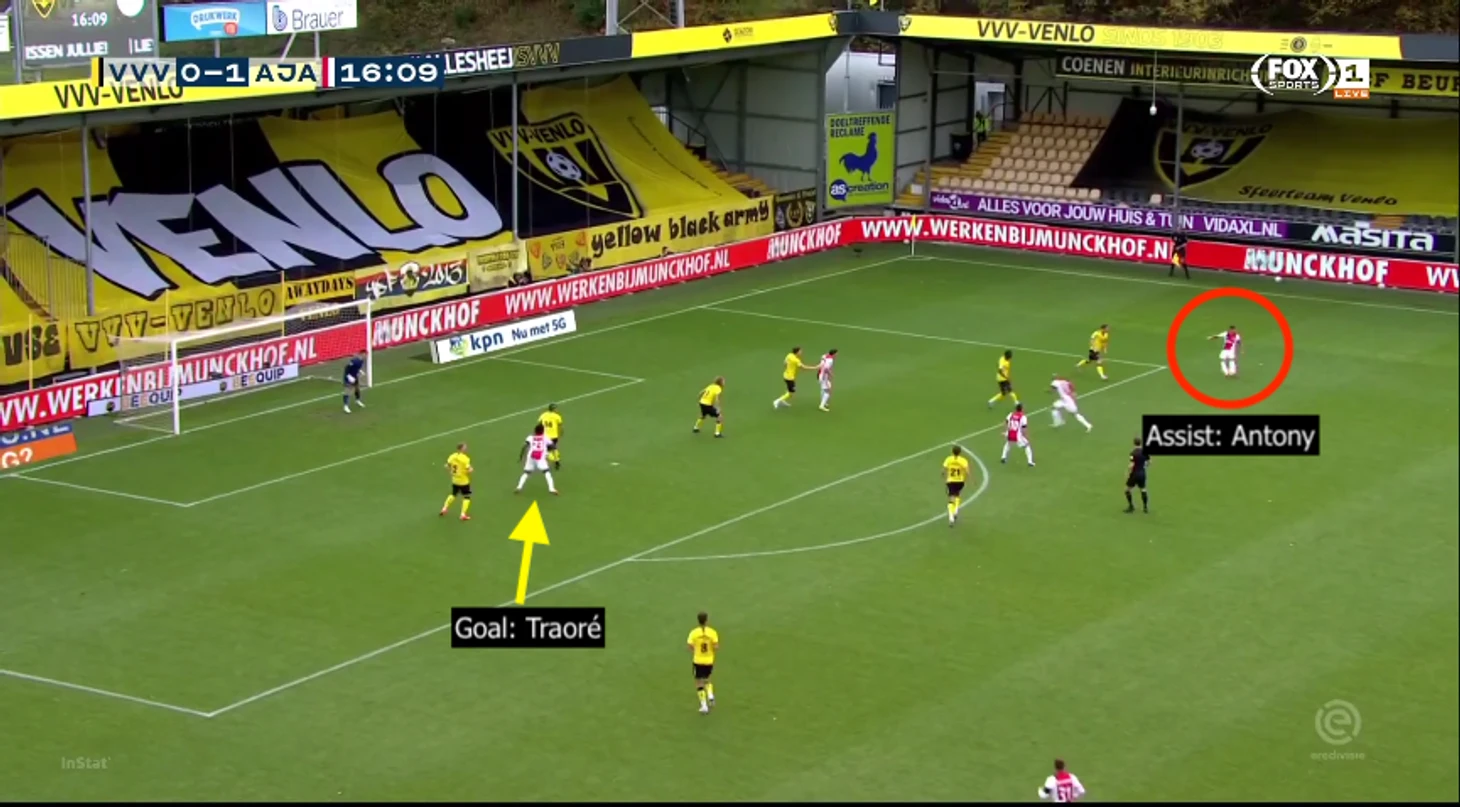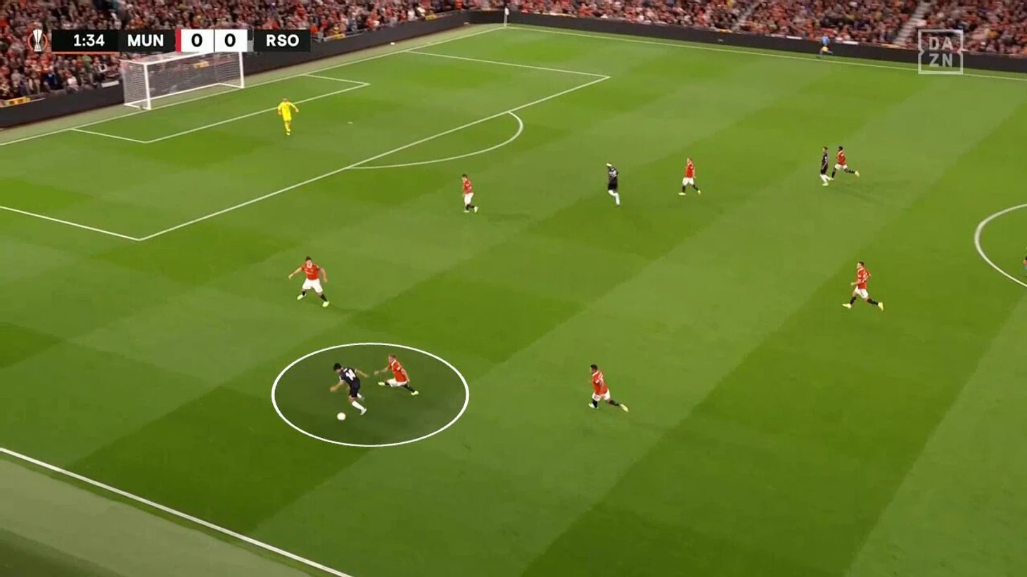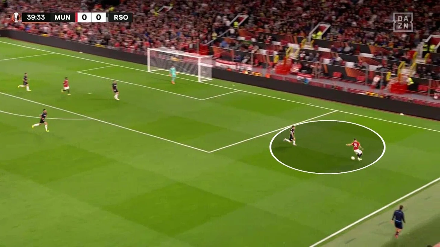 Антони дисциплинированно держал позицию справа, из-за чего оставался с оппонентом 1-в-1 на пространстве: