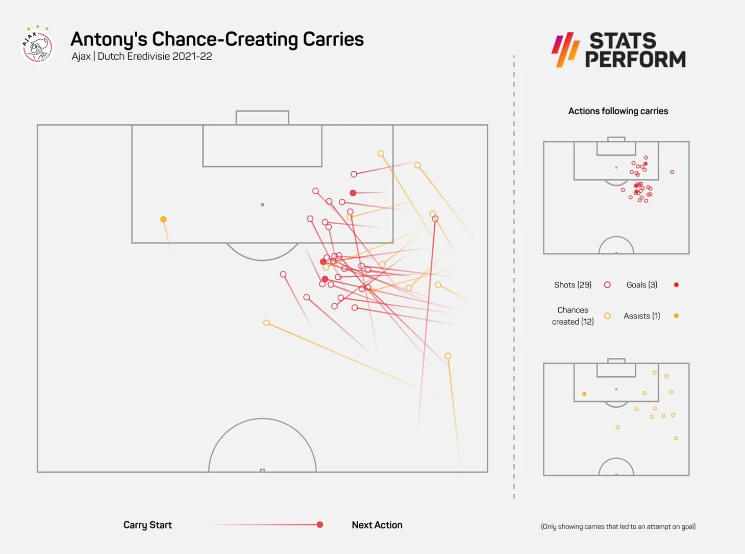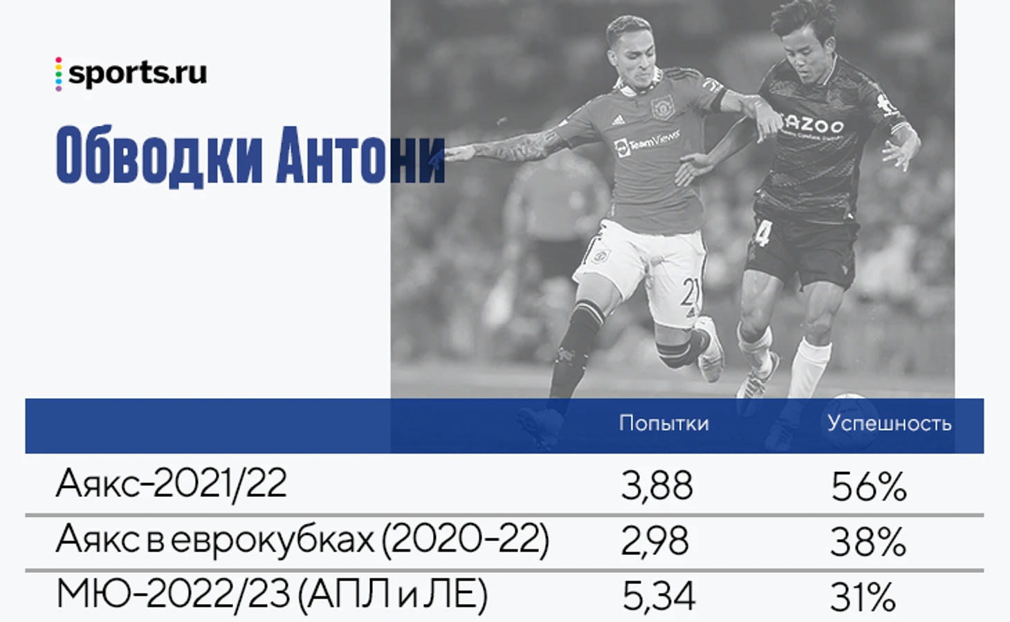 В Нидерландах он часто шел в дриблинг – и весьма успешно для такого количества попыток. В Европе значительно сокращалось и количество попыток, и успешность. На старте в «МЮ» достаточно попыток, но еще большие проблемы с успешностью. Просится гипотеза о более высоком уровне оппонентов, который Антони может не потянуть.