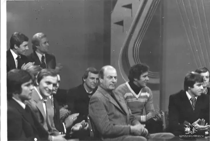 1981г. Харьковский Металлист - Чемпион СССР, среди команд 1 Лиги. Памятная встреча на Харьковском ТВ, осенью 1981, по окончанию Сезона. Слева-напр: стоя: В.ЛИНКЕ - Л.ТКАЧЕНКО. Сидя: Н.Бачиашвили - В.Крячко - А.Горбик(чуть прикрыт) - А.Довбий - Е.Ф.Лемешко - Ю.Сивуха - С.МАЛЬКО - Ю.ЦЫМБАЛЮК.