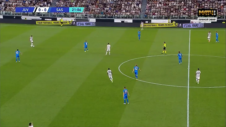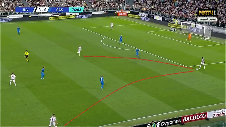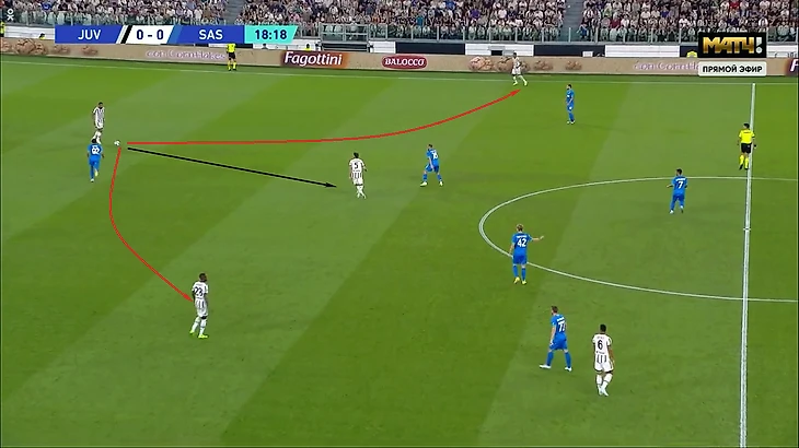 В первом же тайме за «Юве» Бремер привез две атаки за три минуты, выбирая слишком предсказуемый пас в центр. На 19-й минуте он подставил Локателли. Красным на скрине – невыполнимые траектории паса, черным – возможные.
