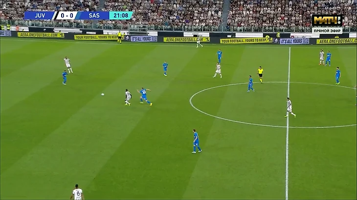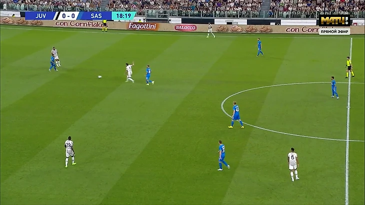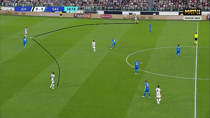 «Сассуоло» сразу взорвался и накрыл опорника на приеме. Обратите внимание: оба раза пас шел под левую ногу. Это еще один недостаток: коридор передачи вынуждает правшу пасовать под левую. Если в полузащите играют правши, прием осложняется.