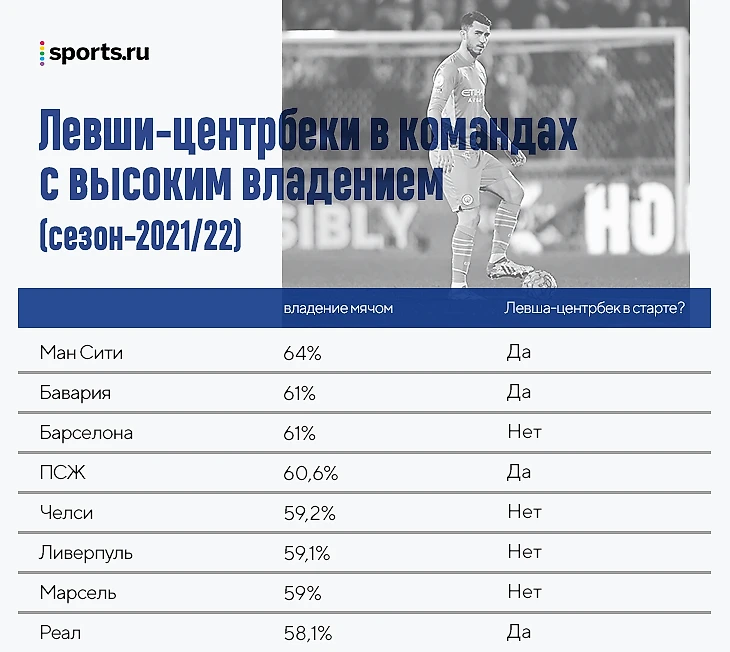 Возможно, именно эта разница определила другой любопытный факт. Три из четырех команд, переваливших за 60% владения по итогам прошлого сезона, опирались на левшей в центре защиты. «Ман Сити» использовал Лапорта, «Бавария» ставила на Эрнандеса, «ПСЖ» – на Кимпембе.