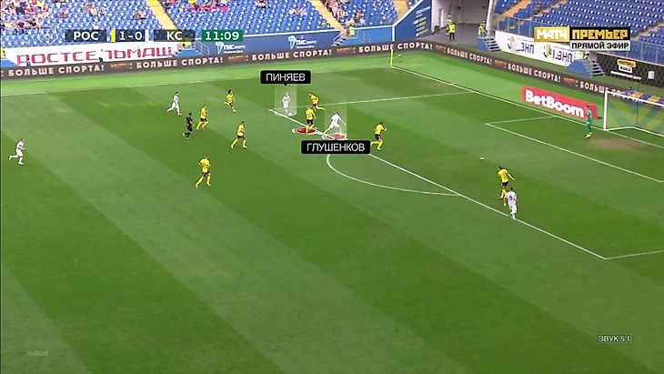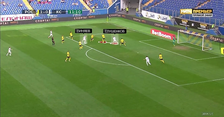 Два удара Пиняев нанес после смещений в середину под правую ногу. Обычно Сергей уходит в центр, когда оказывается 1-в-1 против защитника, а в середине нет страхующего соперника. В таких ситуациях Пиняев достаточно долго готовит удар – бьет с четвертого-пятого касания.