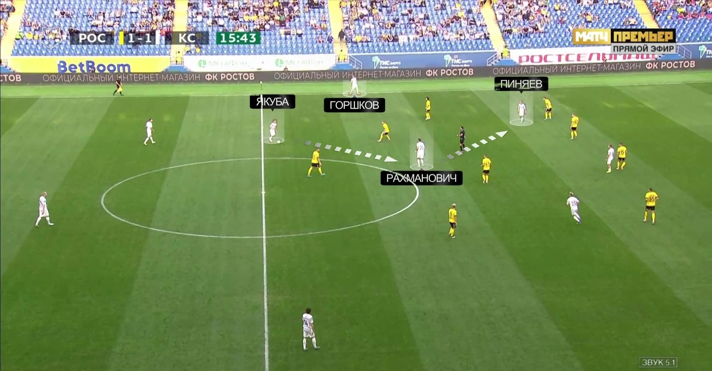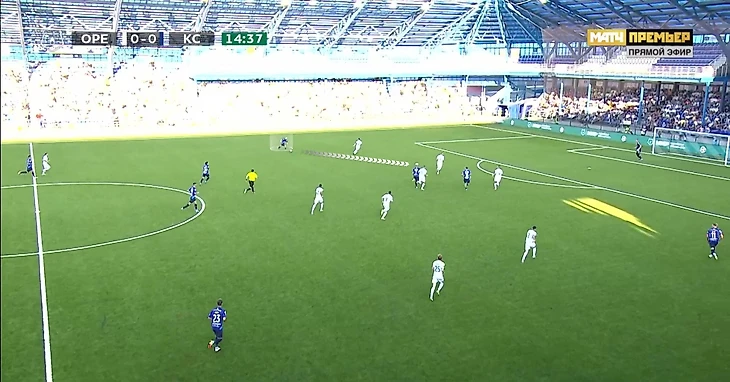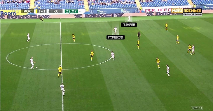 При развитии позиционной атаки у «Крыльев» есть разные варианты на обоих краях. Фланговые защитники могут открываться в полуфлангах (тогда за ширину отвечают крайние нападающие), могут подниматься по бровке – тогда более узкие позиции занимают Ежов и Пиняев/Артем Соколов. Также возможен (хоть и случается реже) сдвоенный фланг – ситуации, когда Ежов находится на одной вертикальной линии с Бейлом, а Пиняев/Соколов – с Горшковым.