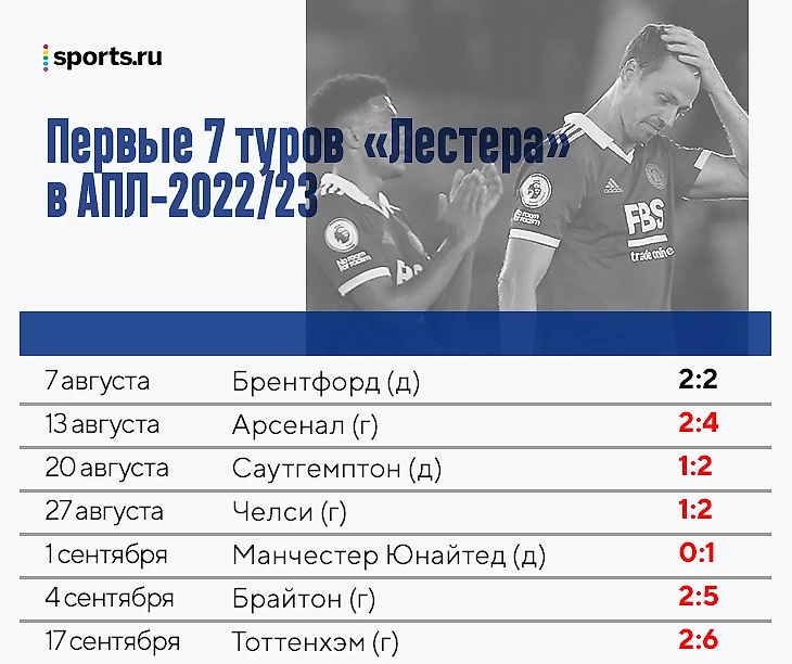Команде Роджерса еще и не везет: за первые 7 туров пришлось сыграть с «Арсеналом», «Челси», «МЮ», «Тоттенхэмом» и взлетевшим «Брайтоном». Две последние игры обернулись кошмаром: 2:6 в Северном Лондоне, 2:5 на «Амекс Стэдиум». 6 поражений подряд (после ничьей 2:2 с «Брентфордом» в первом туре) – худший результат в истории клуба в элите с 1983-го. Пропущенные 22 гола за 7 матчей – худший показатель в истории АПЛ.