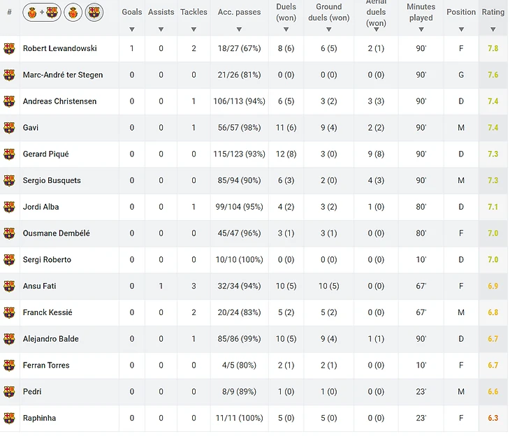 Оценки других игроков: Бускетс 7,5, Гави 7,5, Ансу Фати 7, Кристенсен 7, Пике 6,5, Кессиэ 6,5, Бальде 6,5, Роберто 6,5, Педри 6,5, Ферран 6,5, Рафинья 5,5.