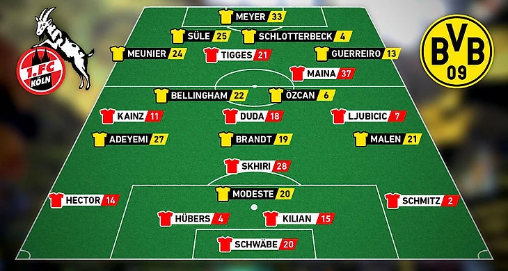 Поскольку с командой в Кельн не поехал простудившийся Матс Хуммельс, а у Мариуса Вольфа обнаружили проблемы со здоровьем, поэтому у главного тренера дортмундской «Боруссии» Эдина Терзича особых вариантов не было, кого выпускать в стартовом составе: Александр Мейер, Рафаэль Геррейро, Никлас Зюле, Нико Шлоттербек, Тамас Менье, Салих Озджан, Джуд Беллингем, Дониэлл Мален, Юлиан Брандт, Карим Адейеми, Антони Модест. Наставник гостей решил сыграть против соперника с помощью схемы 4-2-3-1, которая трансформировлаась в 4-3-3, поскольку Беллингем часто играл ближе к чужим воротам.