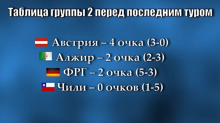 Перед последним туром группы 2, в которой помимо ранее названных числились команды Алжира и Чили, расклады были таковы, что Германия и Австрия проходили дальше в случае победы «Бундесманшафт» с разницей в 1-2 мяча.