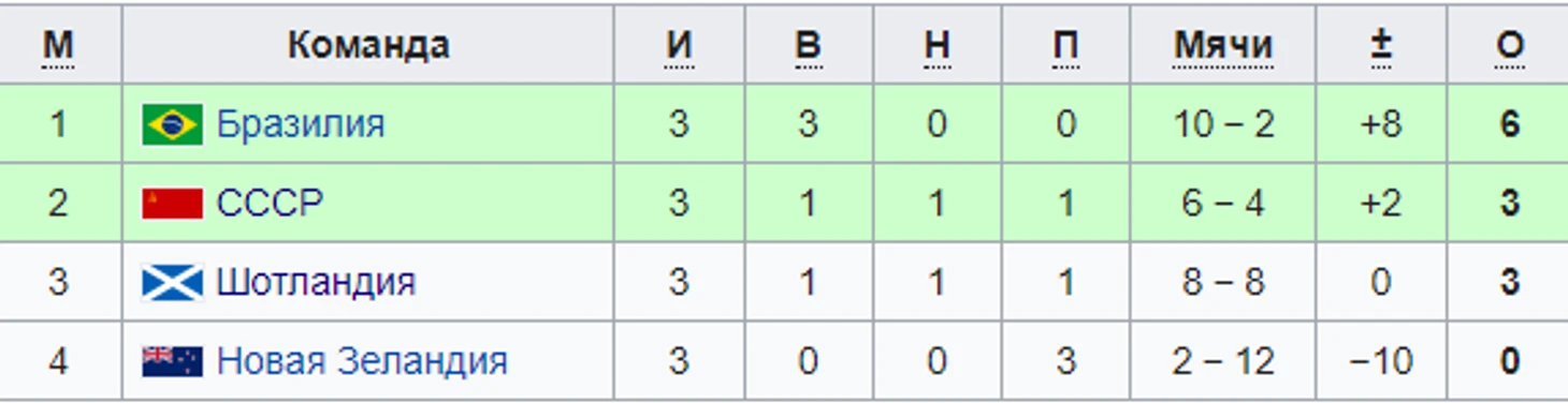 Ну и лишь в заключительном квартете выступали наши любимые советские футболисты, которые пусть и уступили бразильцам 2:1 в 1-ой игре, но всё же вышли со 2-ого места.