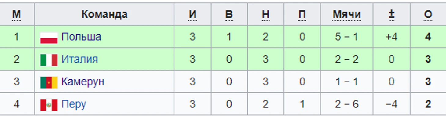 Результаты 1-ой группы Чемпионата Мира сразу дали понять, что представители ФИФА не ошиблись с расширением. Сведя все свои матчи вничью, Камерун был очень близок к проходу дальше, но за счёт того, что у итальянцев была на 1 забитый мяч больше (хотя разница голов и была одинаковой), «скуадра адзурра» оказалась выше, став в итоге 1-ой сборной, которая вышла из группы с 0 в графе побед.