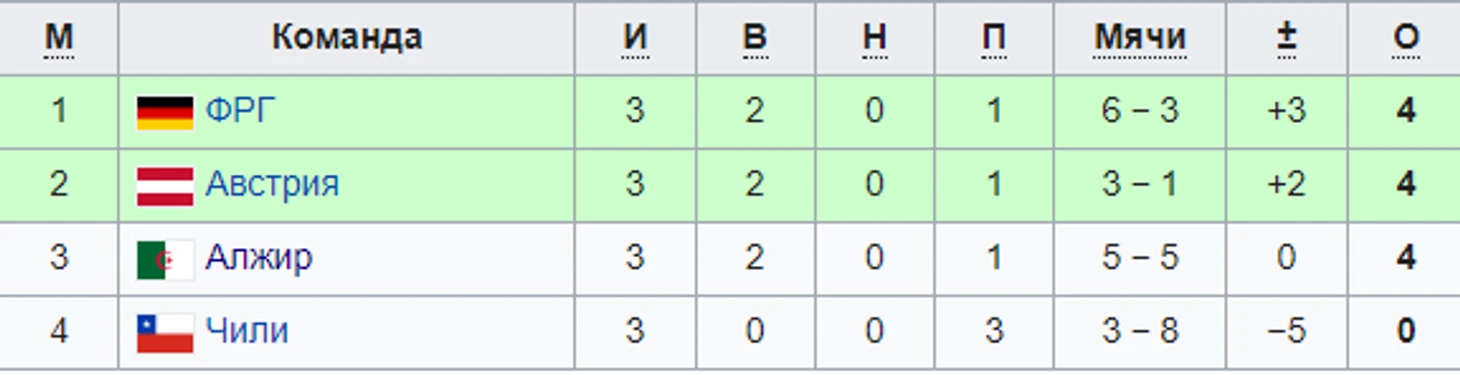 2-ая группа получилась возможно самой скандальной за всю историю кубков мира. О тех событиях поговорим чуточку позже в разделе «Скандалы», обязательно дождитесь. А пока отмечу, что победителями этой группы стали команды ФРГ и Австрии.