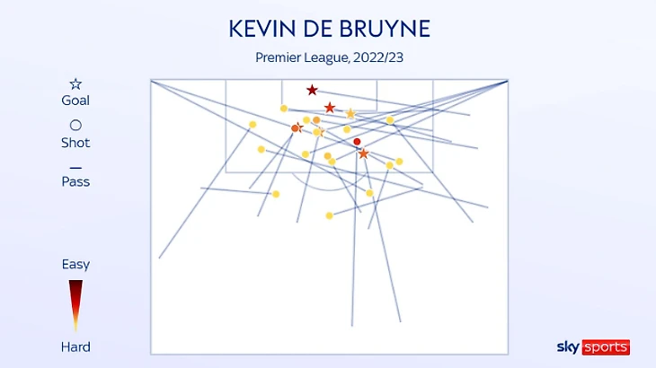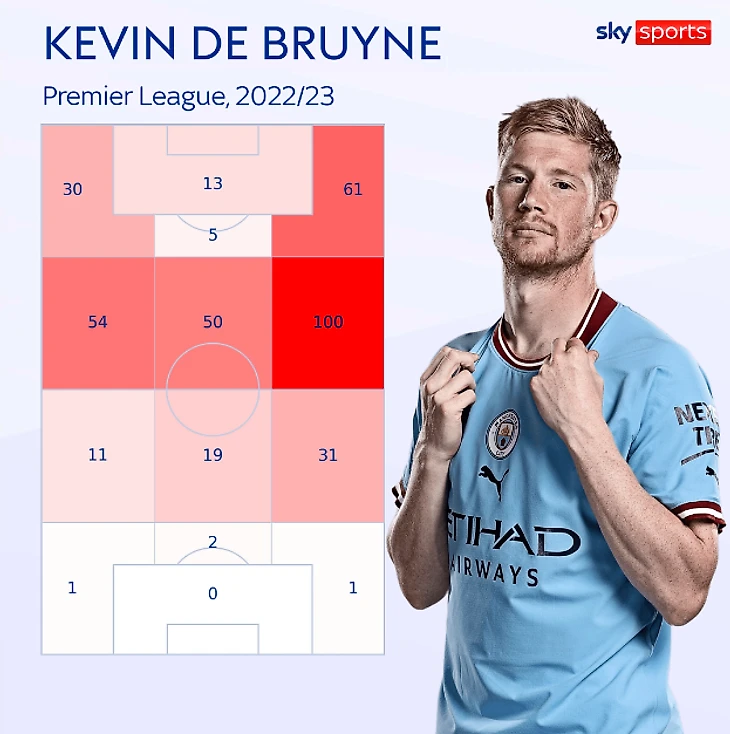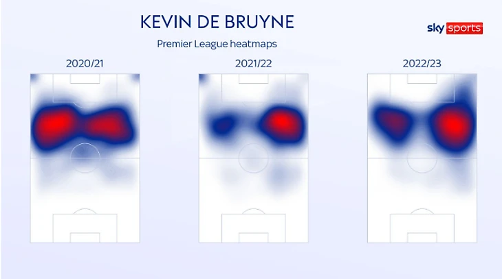 В сезоне-2022/23 Де Брюйне чаще встречает мяч высоко на правом фланге. Кевин открыл новую зону, куда ускоряется за спины защитникам. Смещаться в штрафную бессмысленно: ее занимает Холанд.