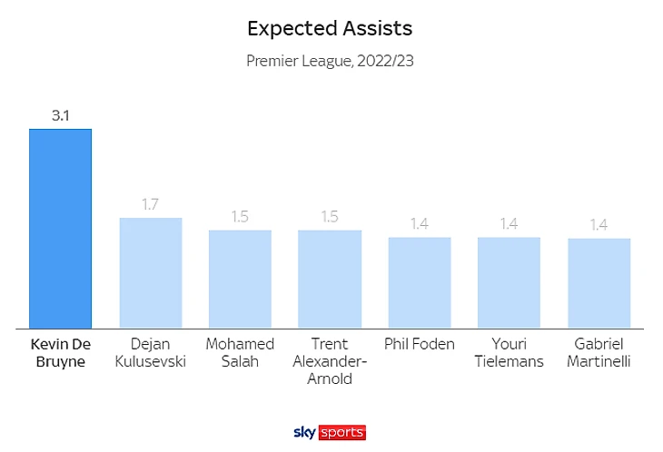 В АПЛ-2022/23 Де Брюйне раздал шесть ассистов – на два больше, чем Букайо Сака. Отрыв от остальных футболистов двукратный. Кевин взял курс на пробитие личного рекорда в 20 голевых передач за сезон.