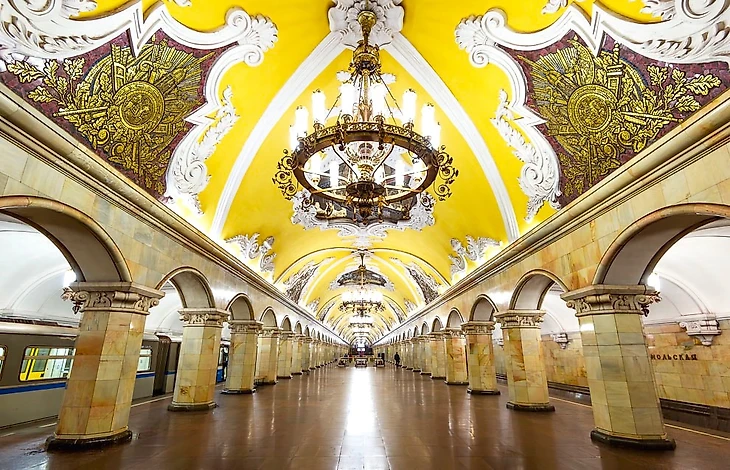 (Кстати, московское метро — это фантастика, его единственным недостатком является общее нежелание пассажиров когда-либо поднимать глаза. В футбольной игре, которую я играл на своем Commodore-64, произошел сбой, из-за которого два игрока, бегущие прямо друг на друга, сцеплялись, яростно крутя ногами и покачивая плечами, но ни один из них не мог проскользнуть мимо другого. Москвичи в метро почти такие же, все склоняют головы и напрягают плечи в ожидании удара. Возможно, это также говорит что-то о русской психике: там, где табло лондонского метро дает тебе повод для ожидания, отсчитывая время до следующего поезда, часы в Москве ведут обратный отсчет, показывая, на сколько ты опоздал на последний [прим.пер.: в современном московском метро уже два табло, отсчитывающее и то и другое время].)