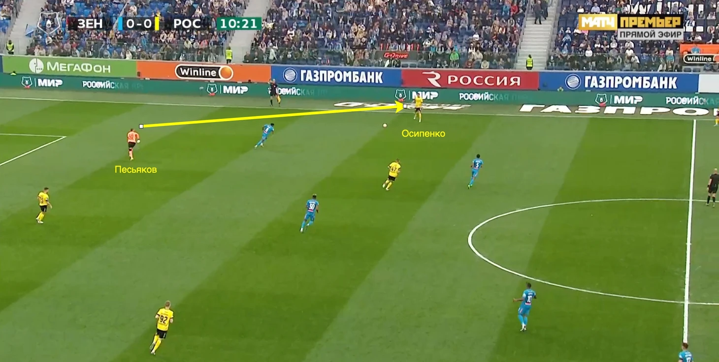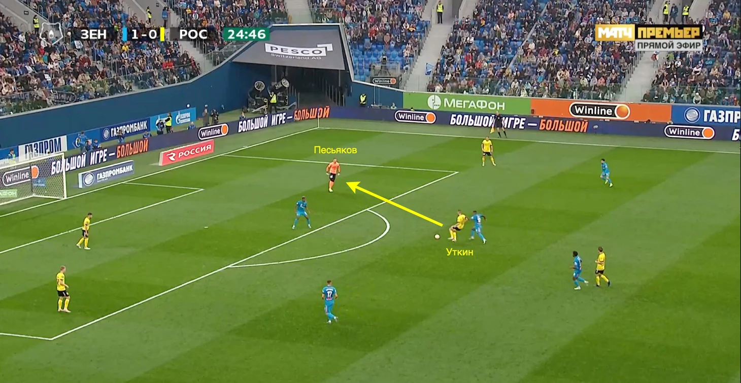 В первом тайме Песьяков почти не ошибался при коротких передачах. лишь в одном эпизоде вратарь «Ростова» допустил серьезный технический брак. На 11-й минуте Осипенко покатил на Песьякова, в прессинг на вышедшего за штрафную вратаря пошел Вендел – Песьяков перекидывал Вендела, пытаясь вернуть Осипенко, но отправил мяч в аут. Плюс в середине тайма не успел вынести мяч под давлением Малкома – «Зенит» забрал мяч у чужой штрафной.