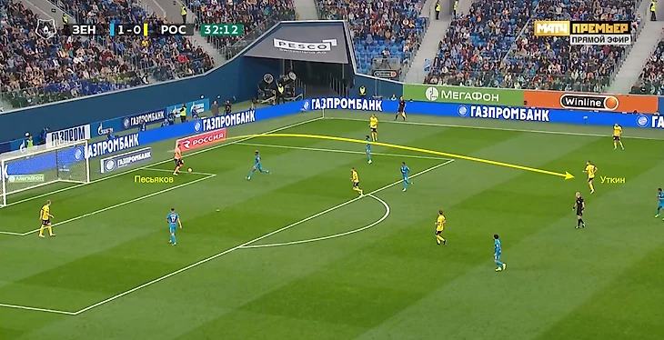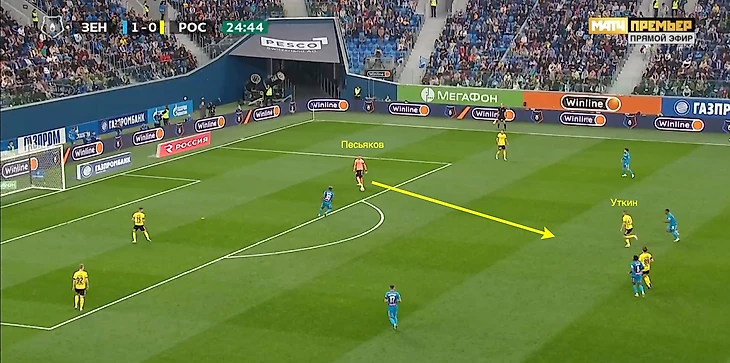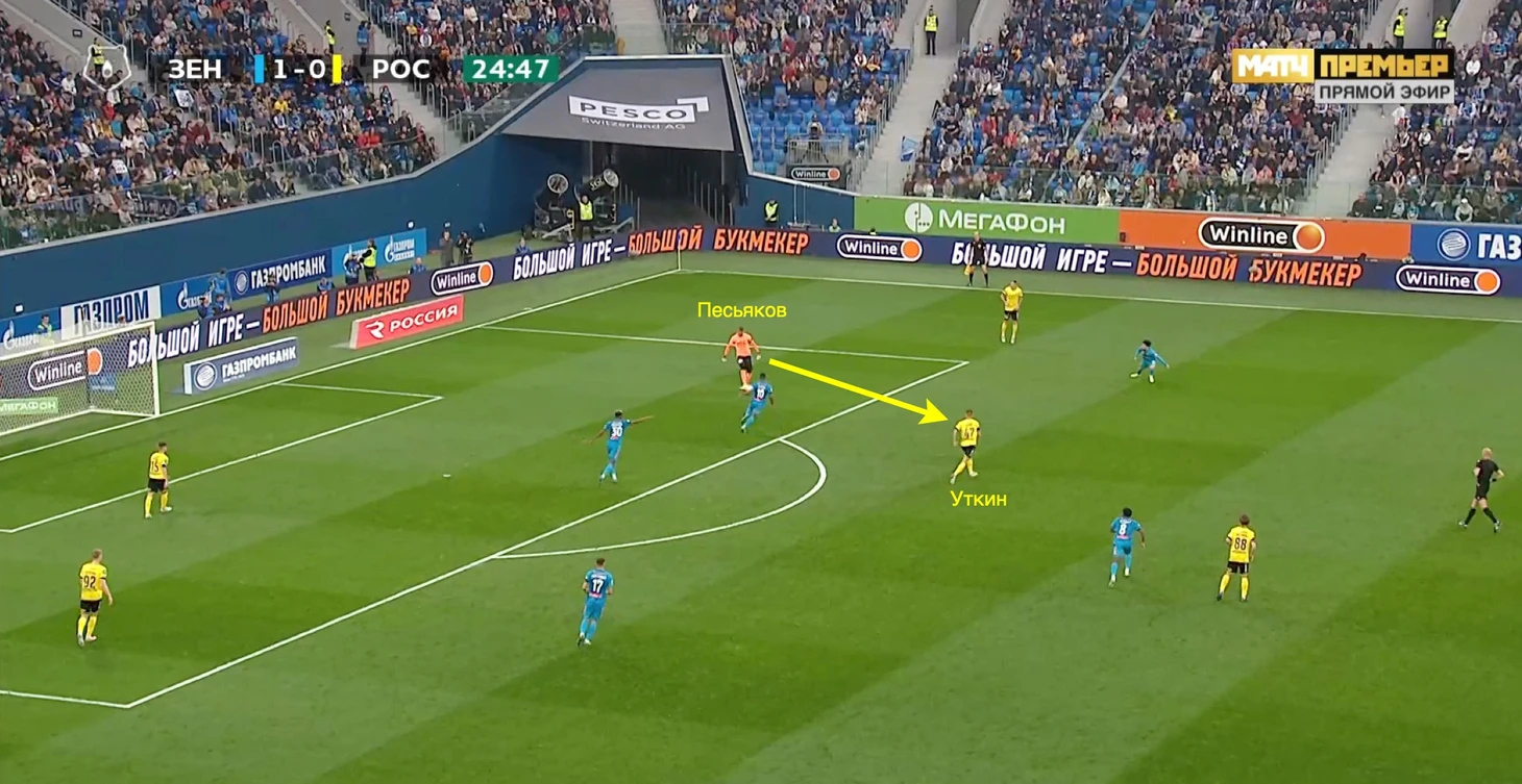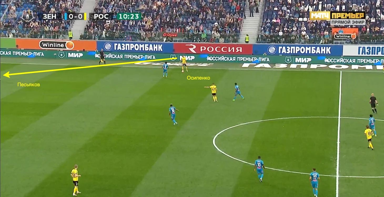 В этом эпизоде проявилась одна из проблем «Ростова» при выходе в атаку. Команда Карпина неплохо вытягивала «Зенит», но не всегда игрок, который получал мяч на свободном пространстве, двигался вперед. В итоге мяч оставался в трети «Ростова».