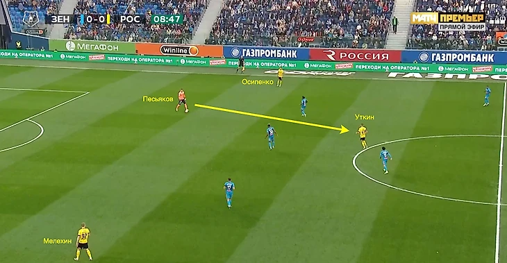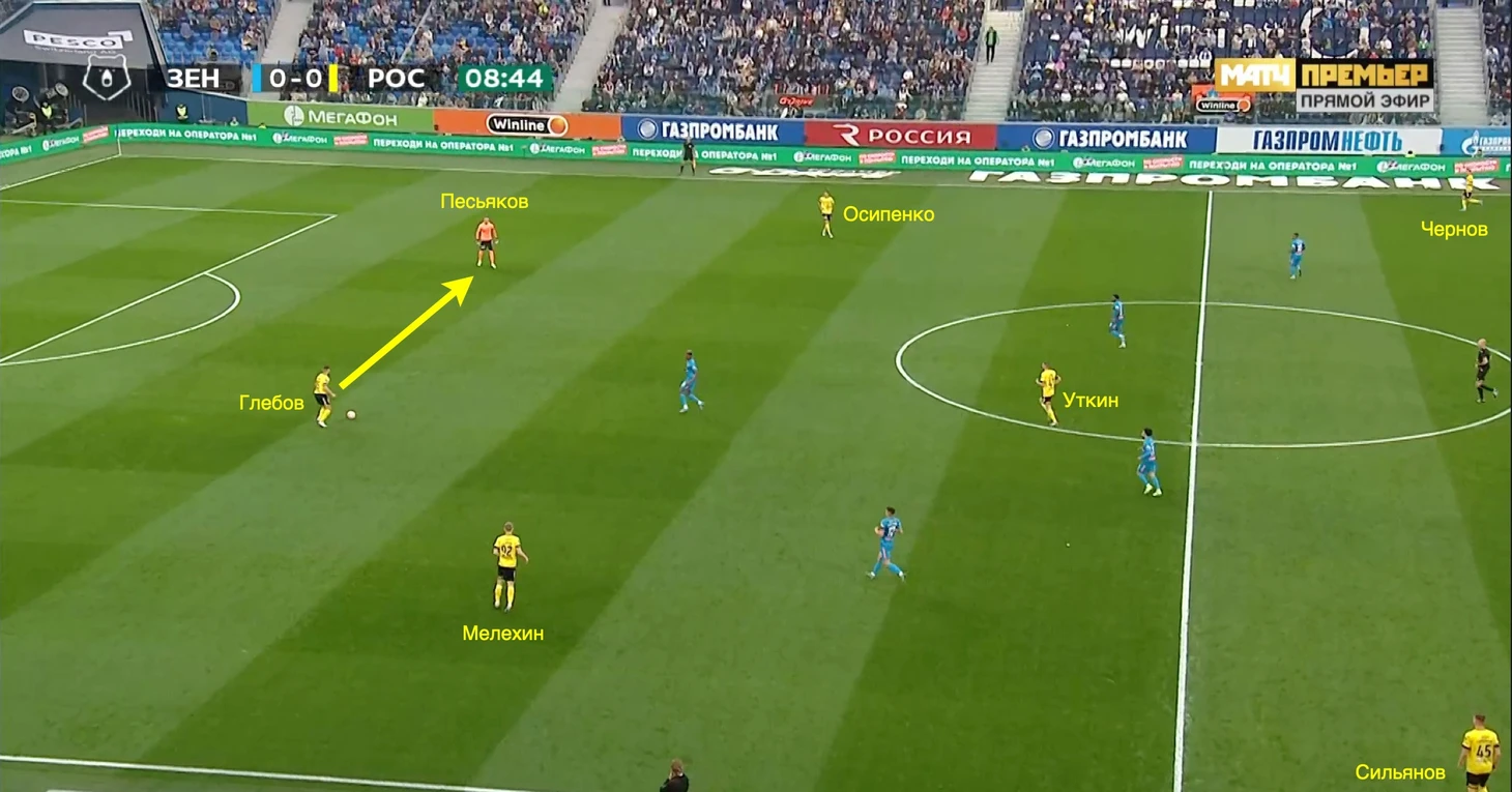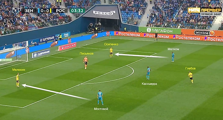Обычно ситуации 3-в-4 или даже 3-в-3 в атаке (когда Караваев выдвигался из оборонительной четверки «Зенита») возникали, когда «Ростов» разыгрывал через тройку Песьяков – Мелехин – Осипенко. По центральным защитникам «Ростова» играли крайние нападающие «Зенита» – Малком и Мостовой, – Кассьерра перекрывал направление паса от Песьякова на Глебова (или находился рядом с Глебовым). Крайние защитники «Ростова» Сильянов и Чернов оказывались свободными.