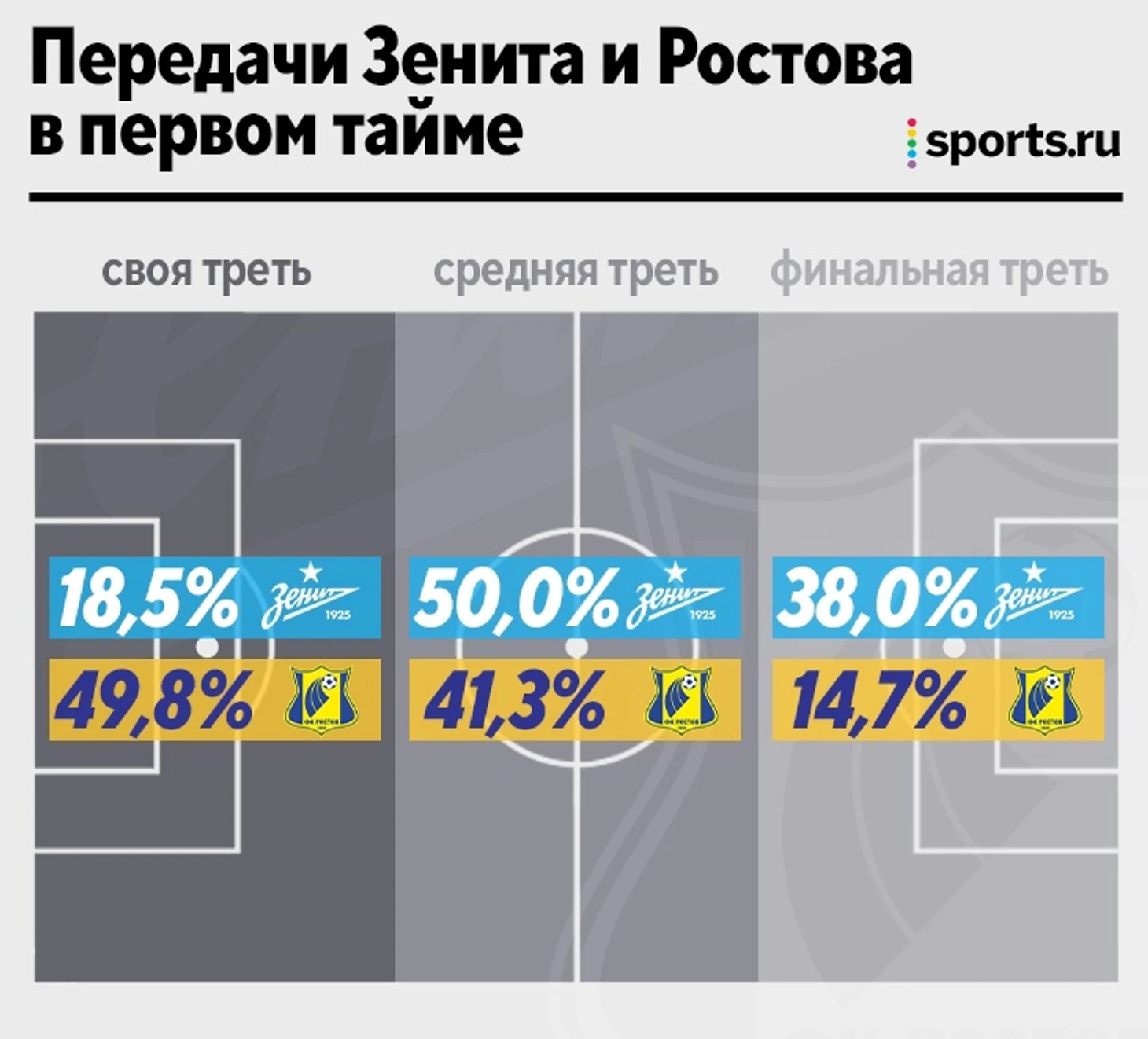 «Зенит» стал лучшим в туре по высоте линии обороны (на каком расстоянии от своих ворот выполняются оборонительные действия), а также количеству прессинг-действий на чужой половине. До перерыва команда Семака делала их немного чаще – в том числе напрягая Песьякова. В этом смысле можно согласиться с Карпиным: в первом тайме Песьяков сделал семь передач под давлением, во втором – два. Похожие цифры у защитников «Ростова» и Глебова.