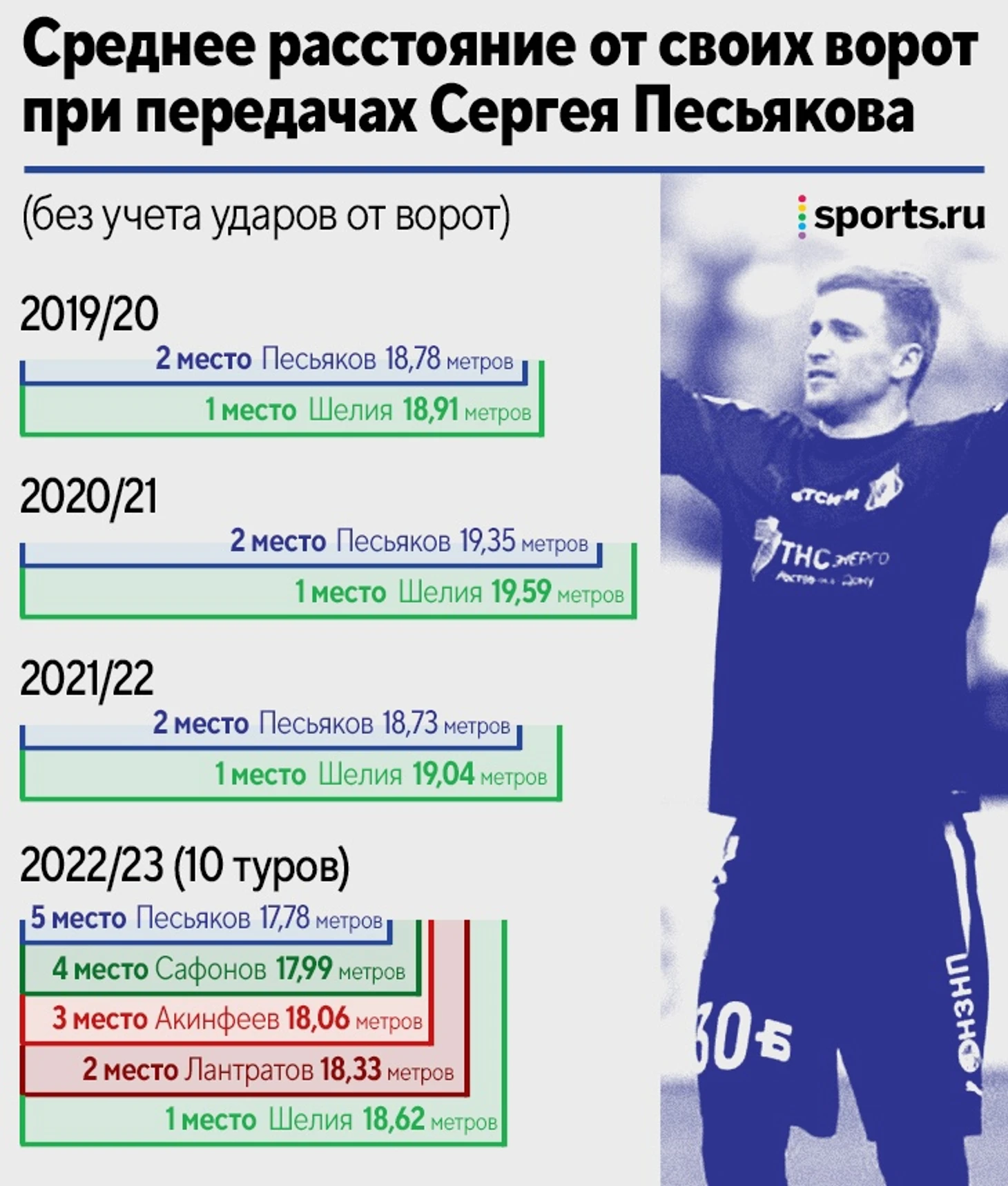 Традиционно Песьяков пасует, находясь достаточно далеко от своих ворот – стабильно выше передачи выполняет только Гиорги Шелия (разница между ними обычно небольшая).