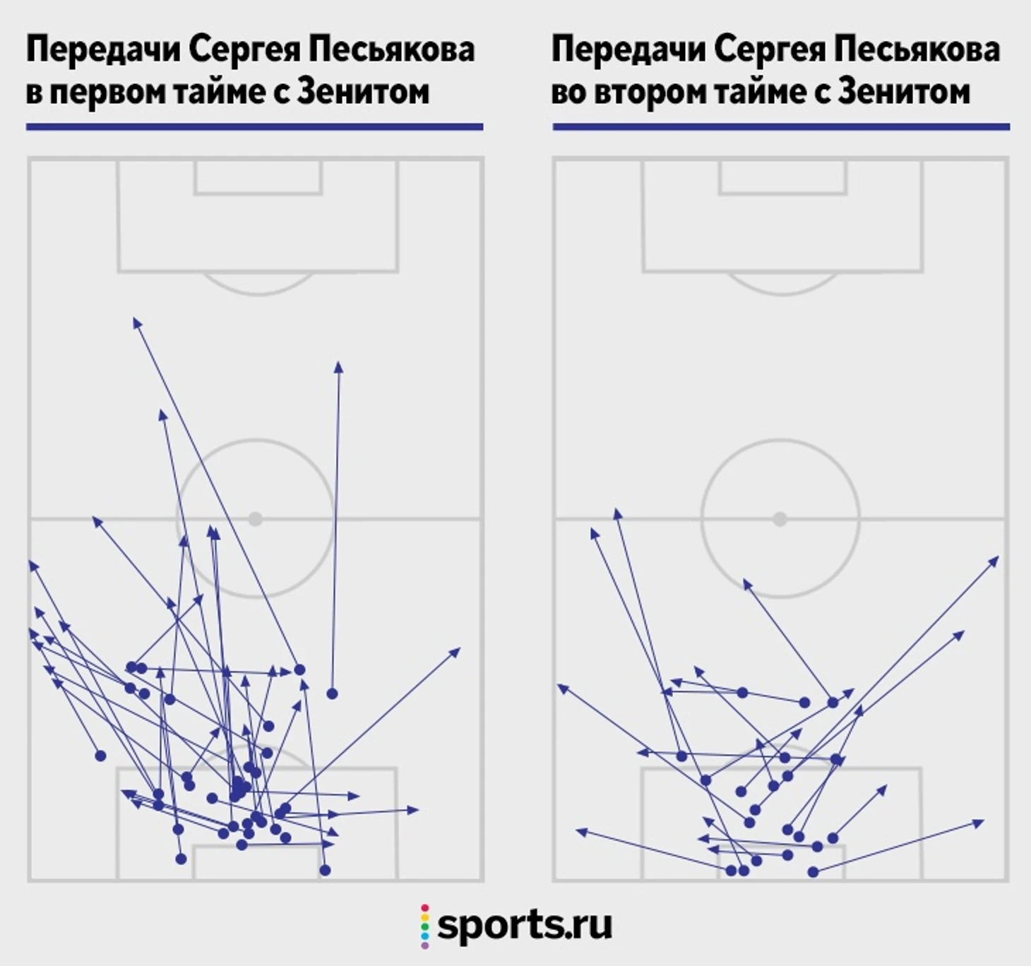 В первом тайме Песьяков совершил 11 действий с мячом за своей штрафной, во втором – только 6. Выдвижений на позицию левого центрального защитника стало меньше.