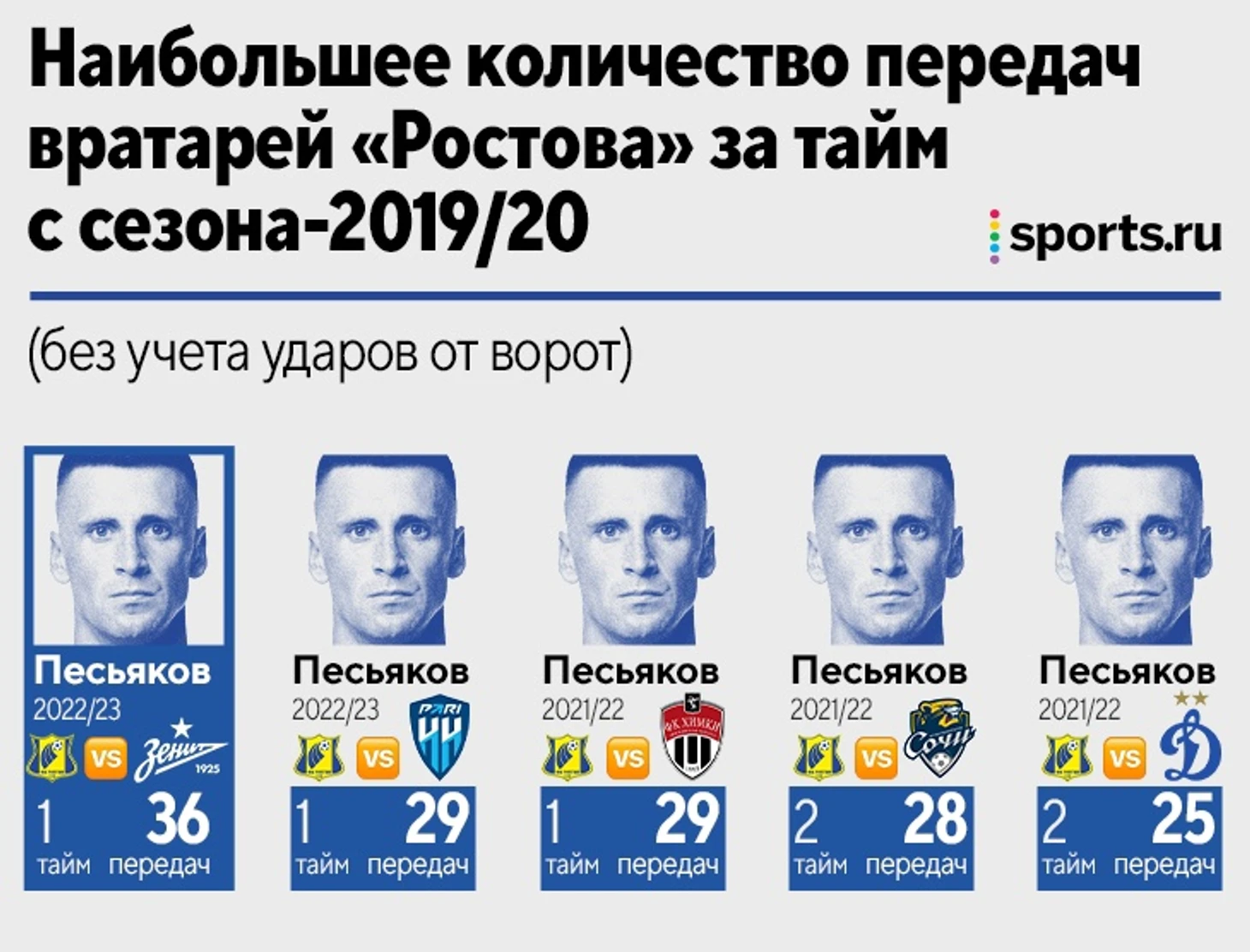За последние четыре сезона вратари «Ростова» не делали так много передач за тайм, как Песьяков в Санкт-Петербурге.