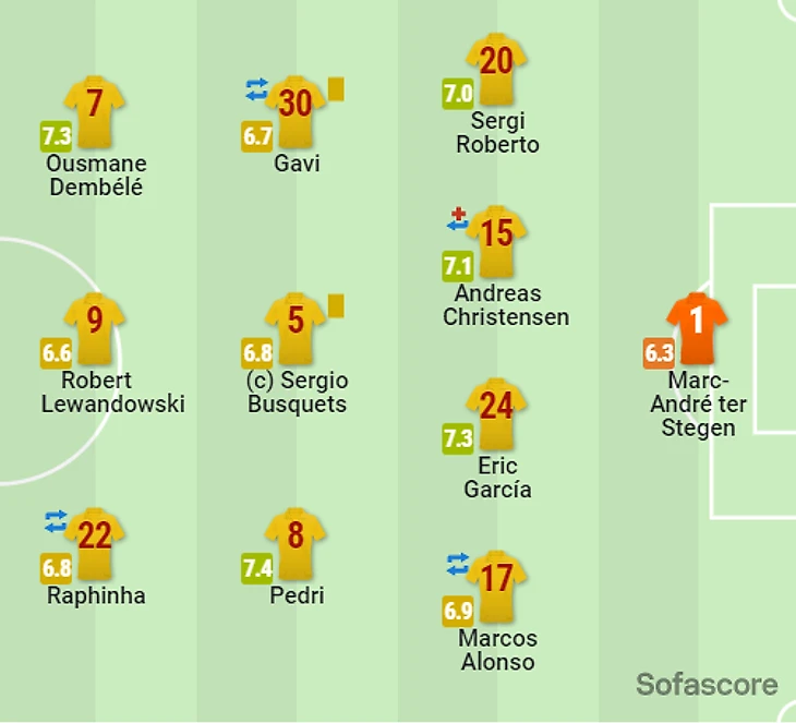 Как по мне, смена флангами Рафиньи и Дембеле напрашивались минут через 30 после стартового свистка, как и заменяя Алонсо на Бальде.