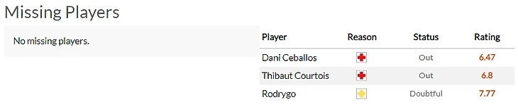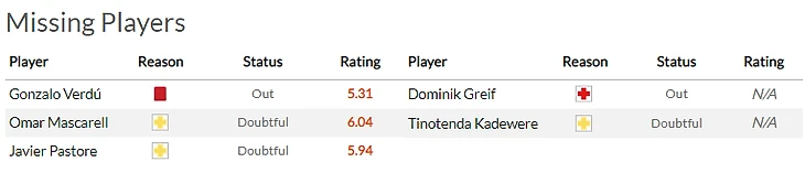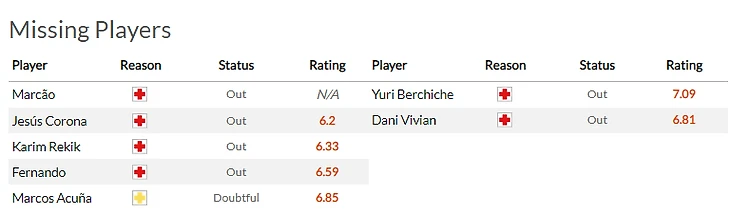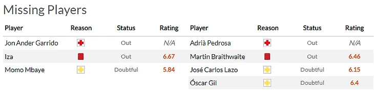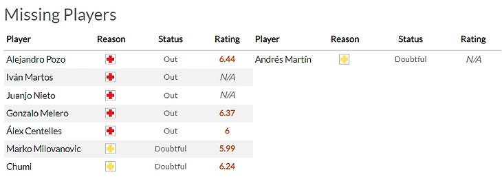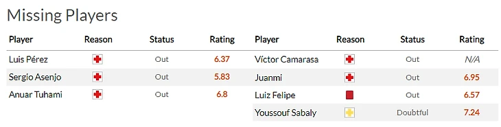 Впрочем в вопросе кадровых потерь с Вальядолидом тягаться сложно. Вдобавок к уже травмированным юнитам в лазарет загремели Эль-Ямик(5) с Кеннеди(6,5), также под вопросом появление на поле Феддаля(5,5), Хоакина Фернандеса(5), Платы(7) и Мальсы(5,5).