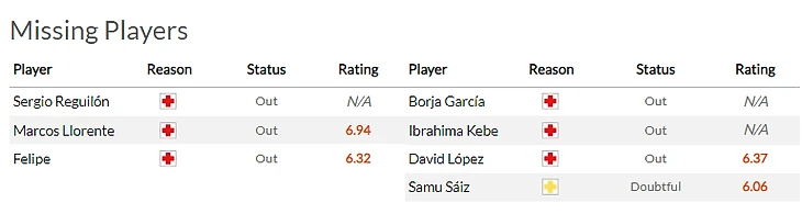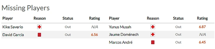 На что обратить внимание: На дисквалификации. На днях испанский КДК влепил импульсивному бразильцу Маркосу Андре(6,5) аж два матча профилактического бана за излишнюю рукастость. Что довольно сильно обедняет атакующий потенциал Валенсии, особенно на фоне новости о травме Саму Кастильехо(7).